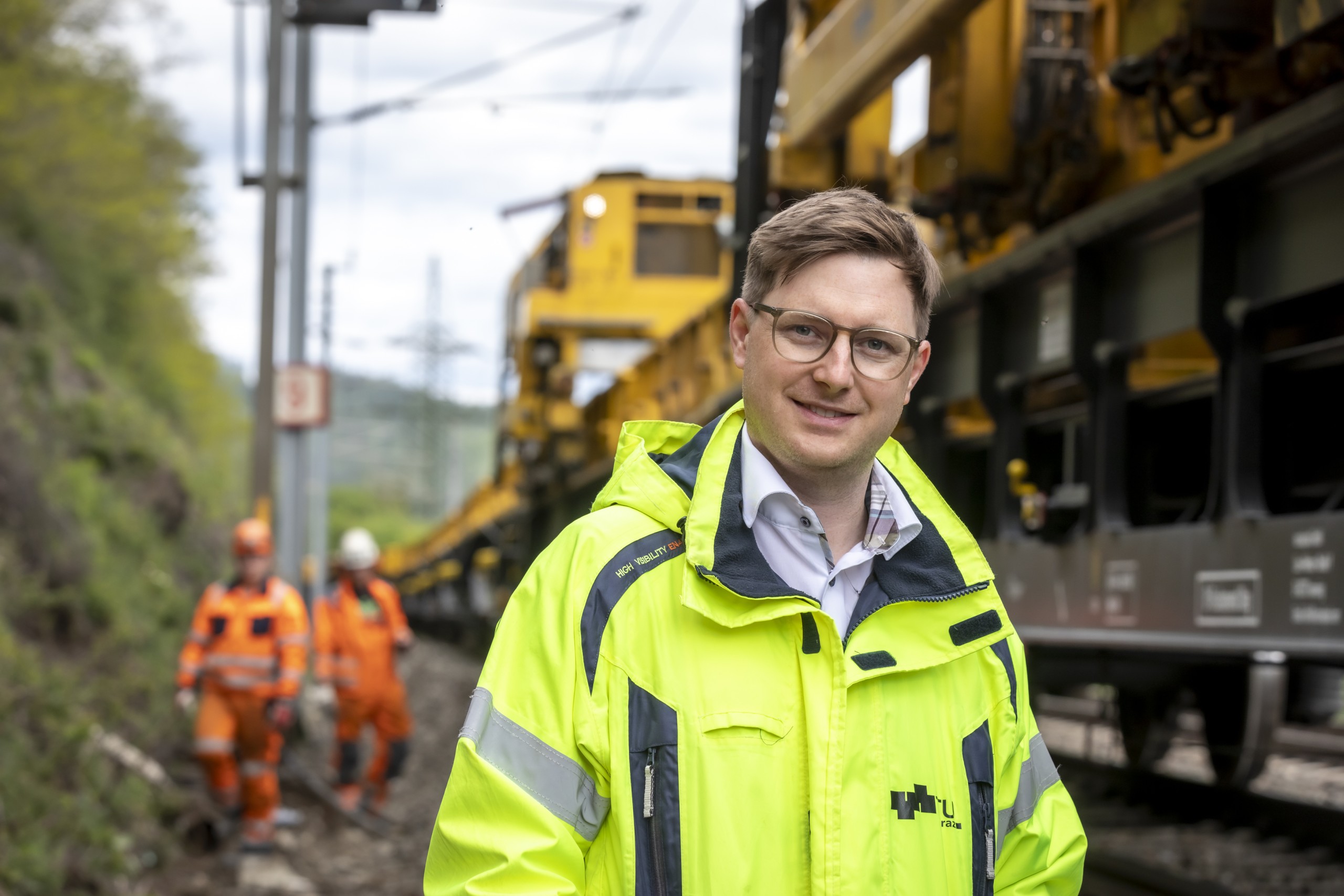 (Matthias Landgraf forscht am Institut für Eisenbahnwesen und Verkehrswirtschaft der TU Graz und untersuchte fossilfreie Antriebsalternativen für Gleisbaumaschinen. Bildquelle: Lunghammer - TU Graz)
